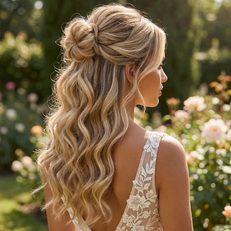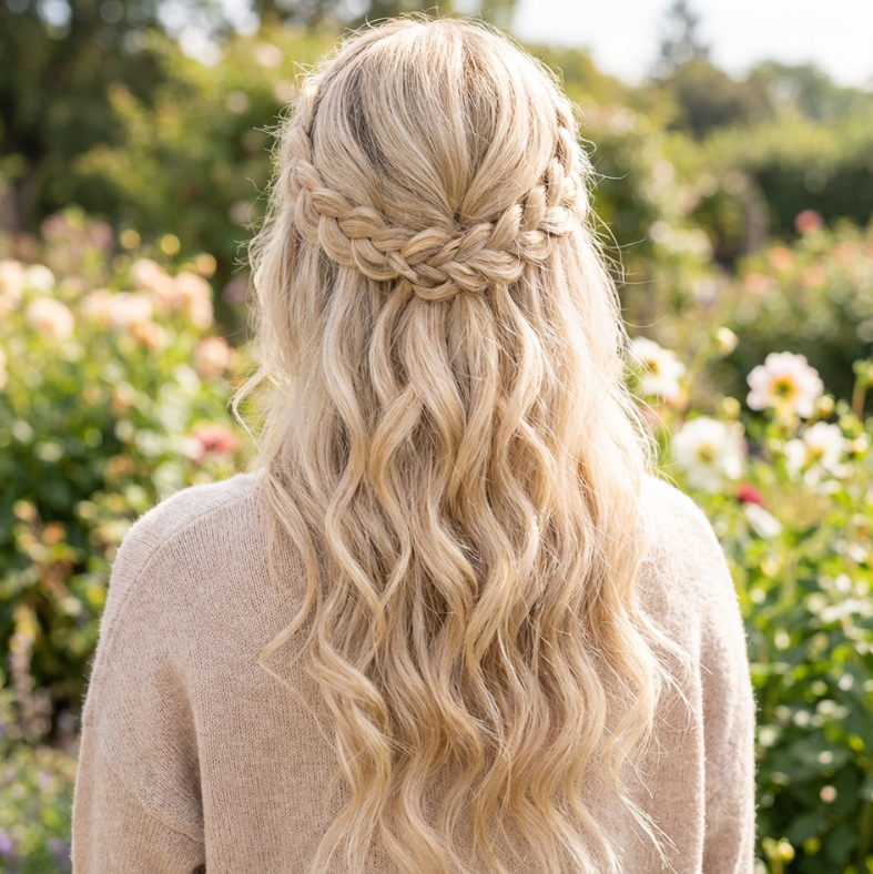 V-Neck: Go for a half-up style (braided crown, twisted half-up). It frames your face without covering the V-neck, making your dress look even more flattering.