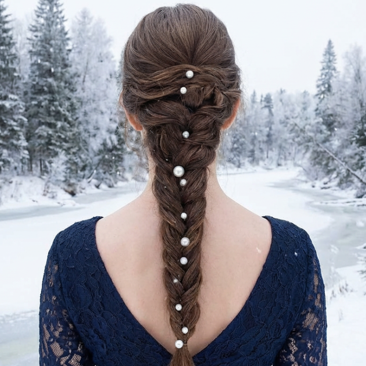 This modern updo is perfect if you want a confident, stylish look. Pull your hair back into a high, messy bun at the top of your head, with layers to add texture. Add blonde streaks (or any highlight color) that stand out against your natural hair—they add a fun edge without being too bold. Add a few pearl pins to the bun for a fancy touch—it balances the edgy streaks and matches this year’s pearl trend. Choose black, red, or dark jewel-toned dresses, as the blonde streaks stand out against dark fabric, making your look pop in photos. If you don’t want permanent highlights, use clip-in streaks—they’re easy to add and remove.